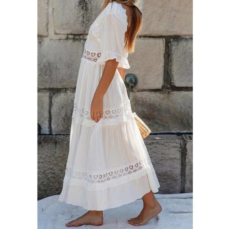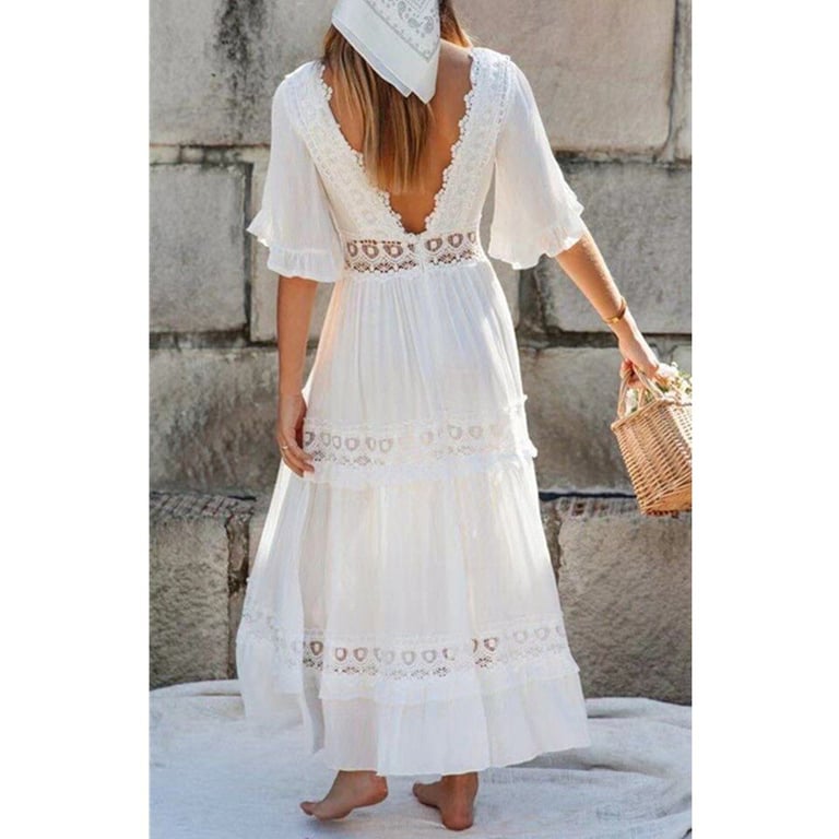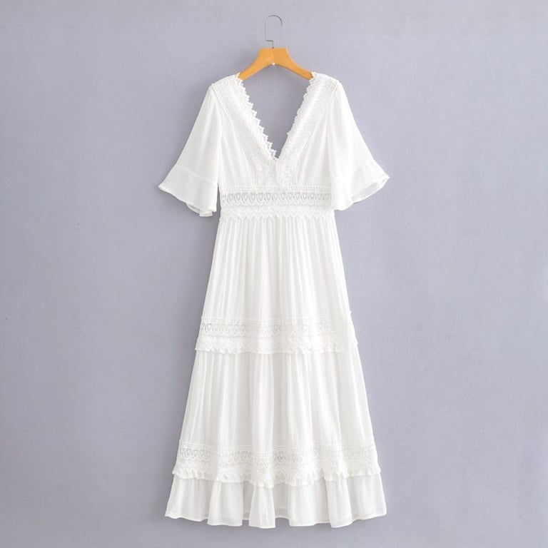 Vestido largo blanco en estilo boho con detalles de ganchillo.