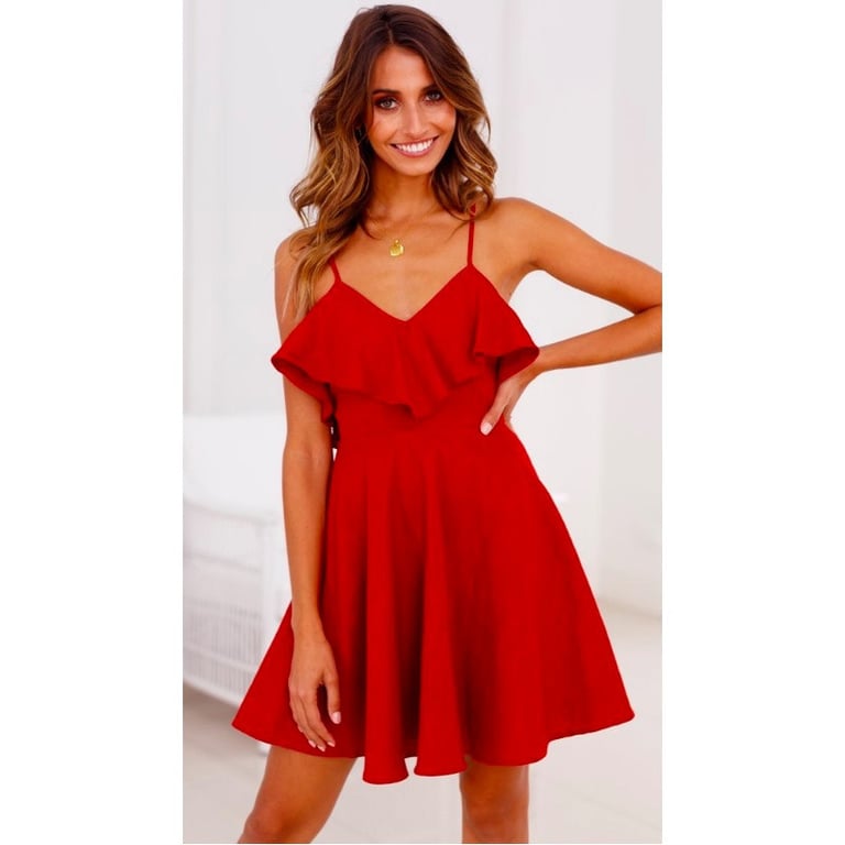 Vestido de mujer en un romántico color rojo. Con tirantes finos cruzados en la espalda y una corta falda en forma de A. El vestido tiene un escote en V profundo con volantes.