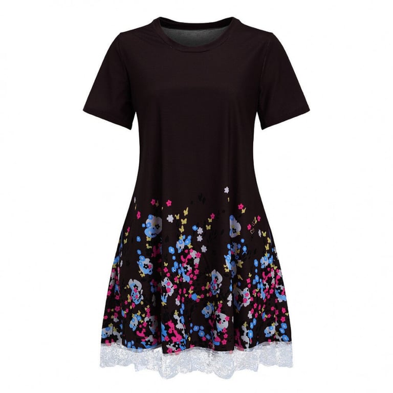Vestido de mujer con mangas cortas. Corte holgado con bolsillos laterales y adornos de encaje. Estampado colorido con motivo floral. Varias opciones disponibles.