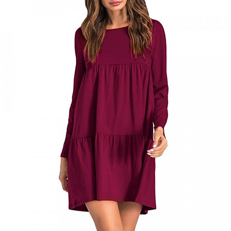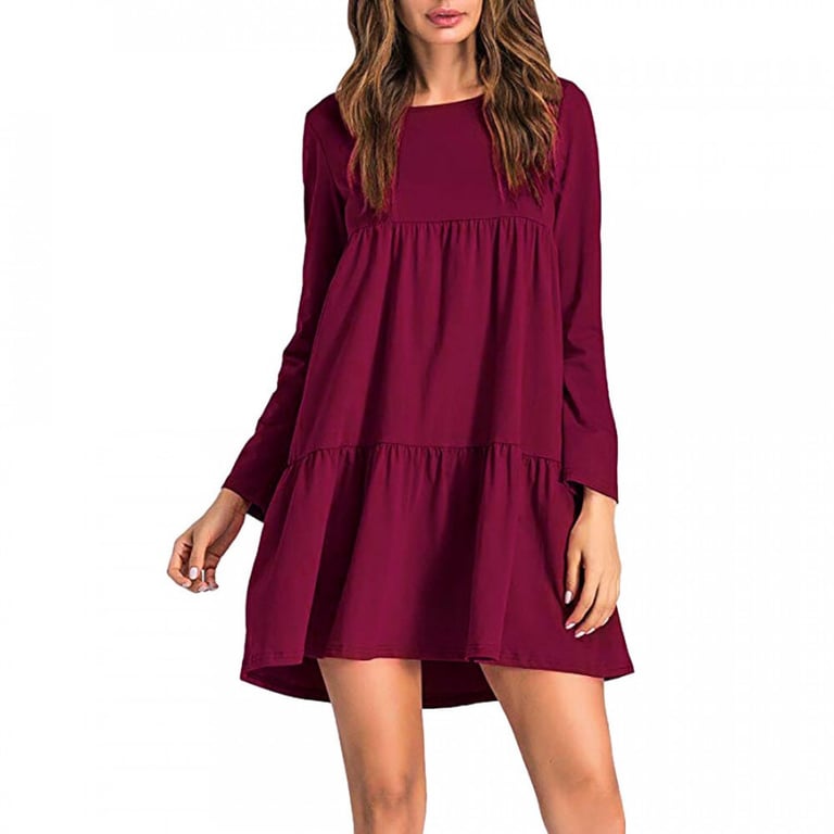 Vestido de mujer con mangas largas y escote redondo. El vestido tiene un corte suelto en forma de A con volantes. Disponible en dos variantes.