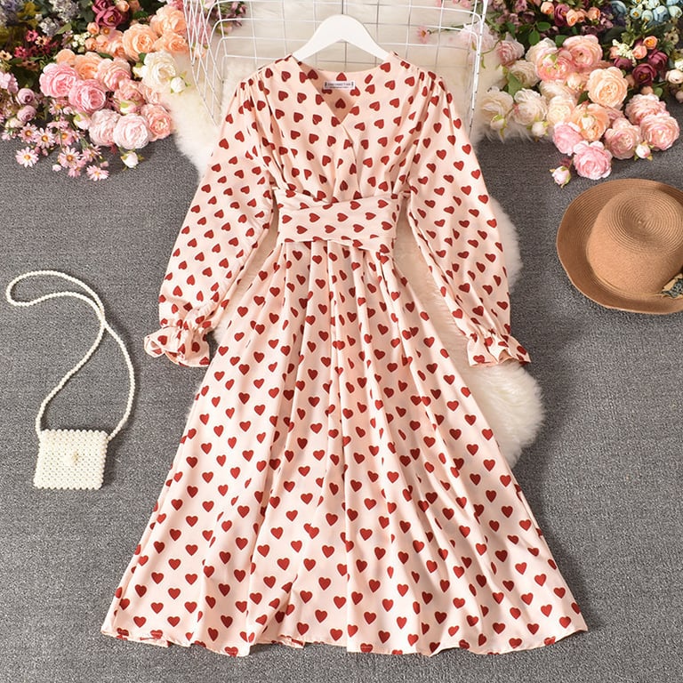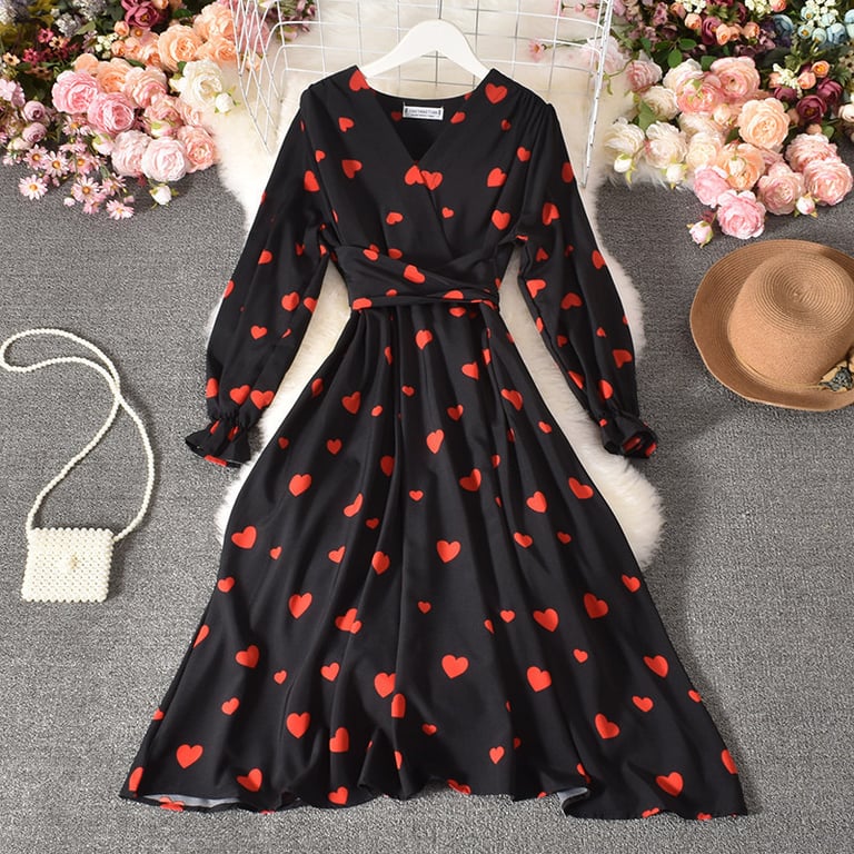 Vestido de mujer en forma de A con mangas largas y motivo de San Valentín.
