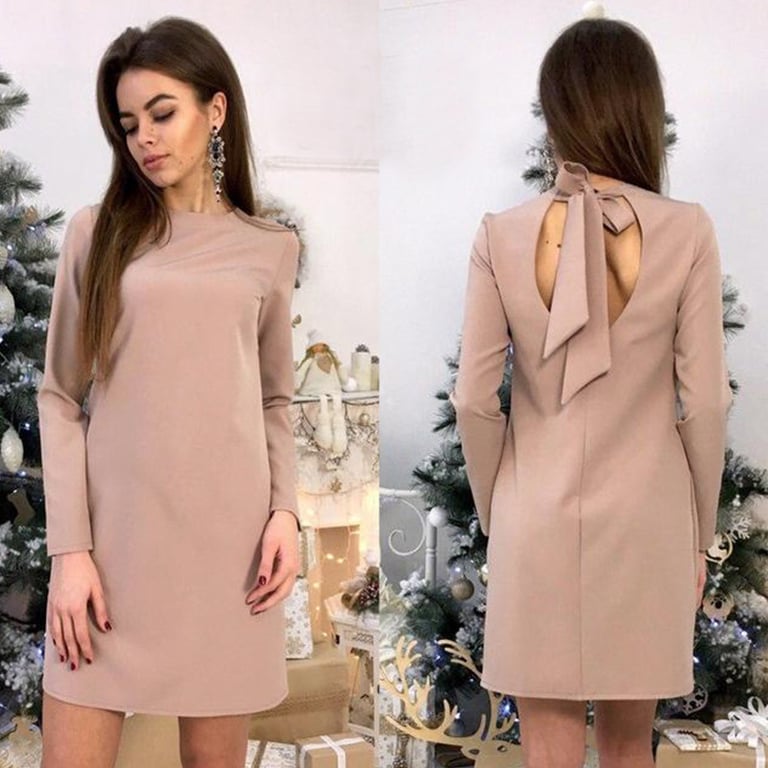 Vestido corto de mujer de corte suelto con mangas largas. El vestido tiene un escote en V en la parte posterior y un lazo para atar. Disponible en varias opciones de color.