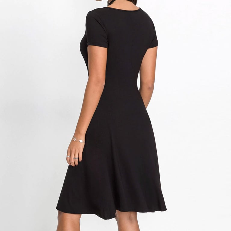 Vestido de mujer con mangas cortas y escote en V con detalle de nudo. Falda de corte acampanado con longitud hasta la rodilla. Material ligero y aireado. Disponible en varios colores.