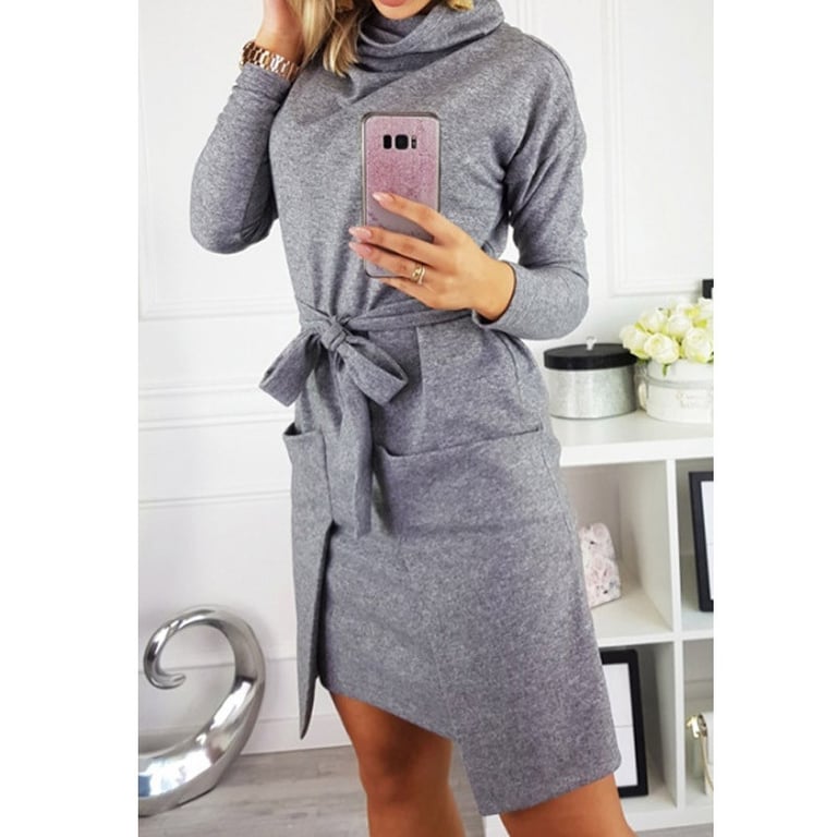 Vestido de mujer con mangas largas y cuello de chal. Corte holgado. Bolsillos laterales. Cinturón para atar en la cintura. Varias opciones de color.