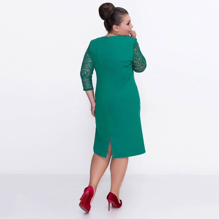 Vestido de cóctel para mujer con mangas 3/4. Corte ajustado con longitud hasta la rodilla. Las mangas y la parte delantera del vestido están adornadas con encaje. Tallas grandes. Disponible en varias opciones de color.