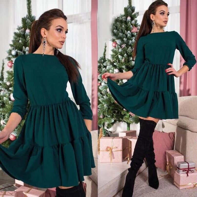 Vestido de mujer con escote redondo y mangas 3/4. El vestido tiene una falda corta de corte suelto con volantes. Disponible en cuatro variantes de color: negro, azul, verde y rojo.