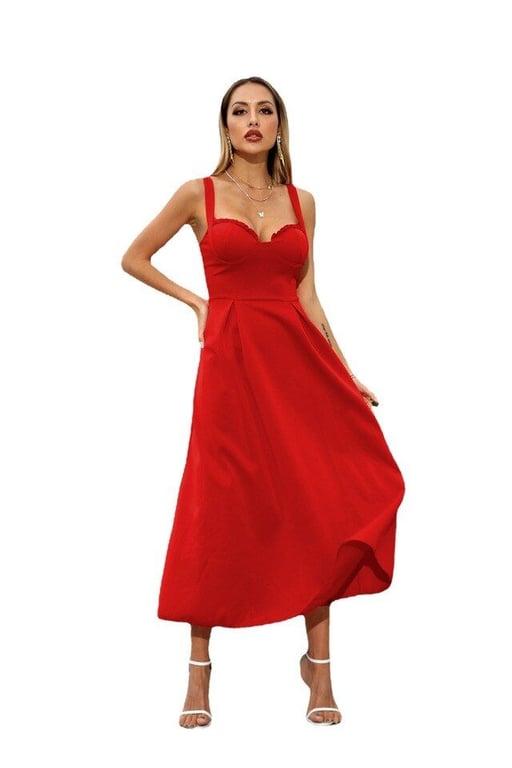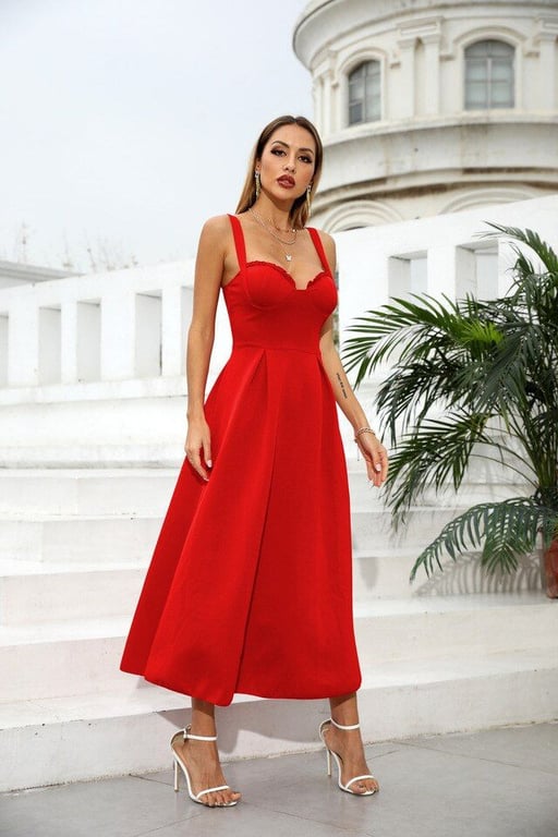 Un hermoso vestido con tirantes anchos y un escote profundo que te convertirá en la estrella de cualquier fiesta.