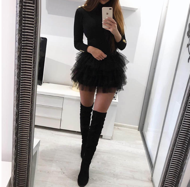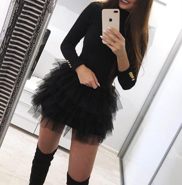 Vestido de noche negro para mujer con falda de tul.