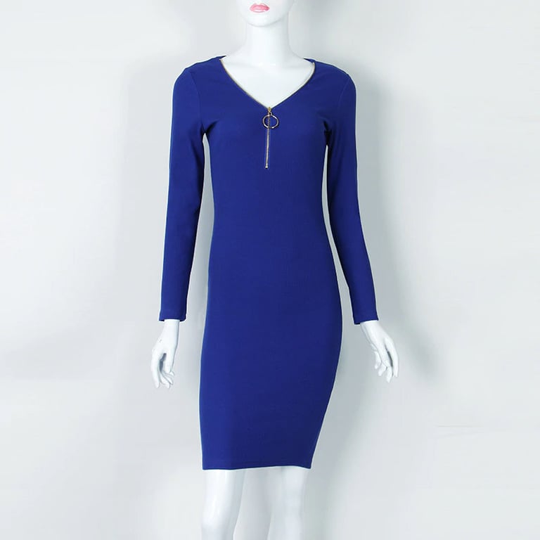 Vestido de punto para mujer con longitud hasta la rodilla y mangas largas. El vestido tiene un escote en V con cierre de cremallera. Disponible en varias opciones de color.