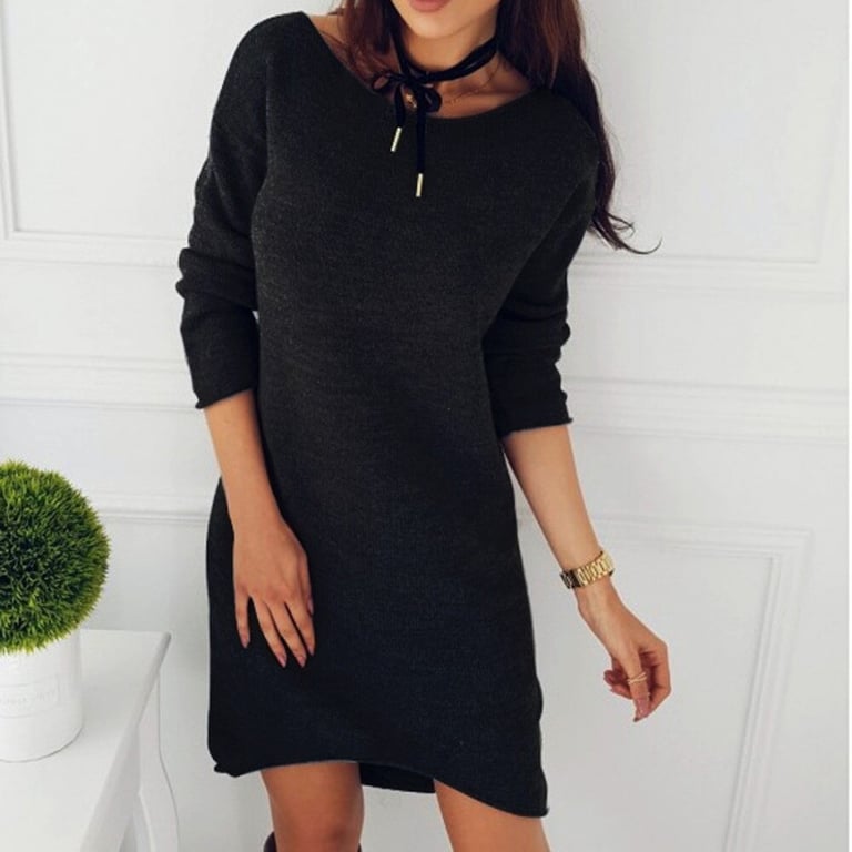 Vestido de punto para mujer con escote redondo y mangas 3/4. Corte corto y suelto. Disponible en varias opciones de color.