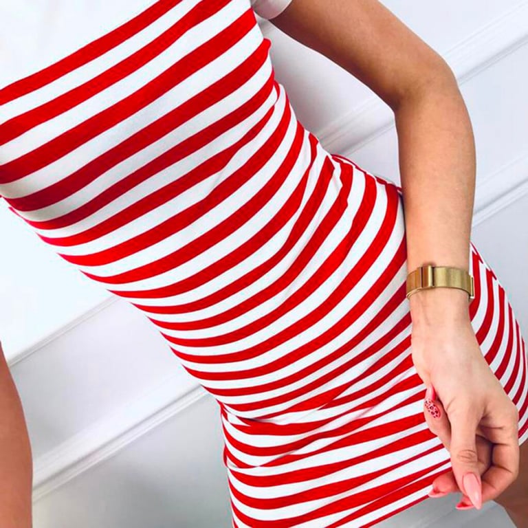 Vestido de mujer con mangas cortas y escote redondo. Corte corto ajustado. Estampado con patrón a rayas.