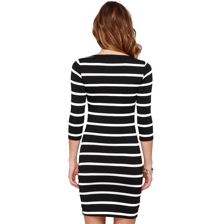 Vestido ajustado para mujer con mangas 3/4 y escote redondo. El vestido tiene un patrón de rayas en blanco y negro. Disponible en dos variantes.