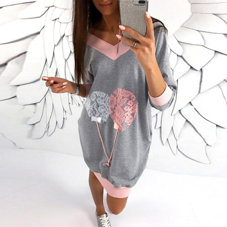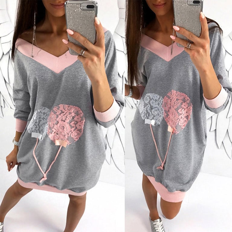 Sudadera larga para mujer o vestido de corte suelto con mangas largas y escote en V. En la parte delantera, un parche de globos. Disponible en tres variantes de color.
