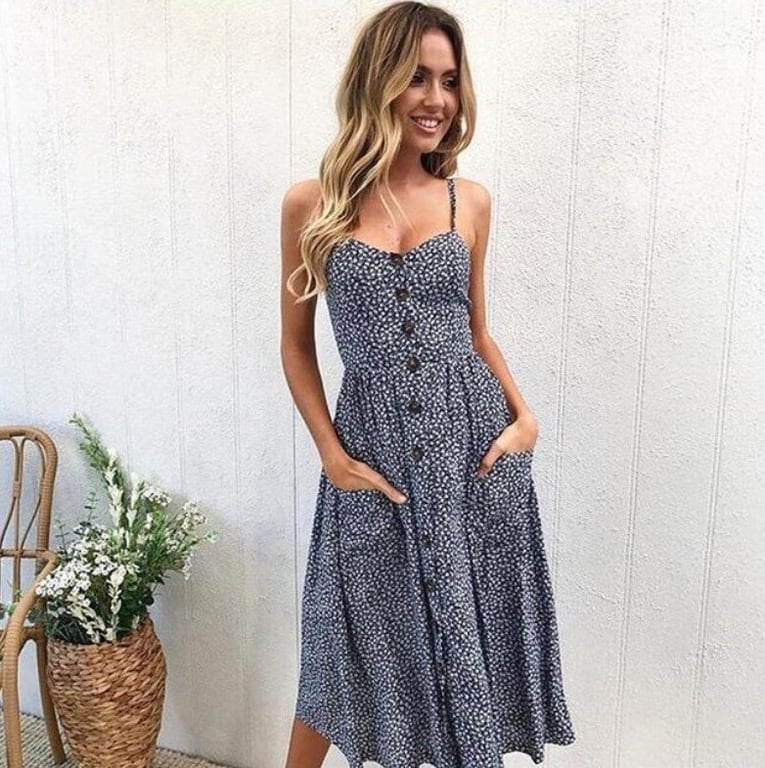 Vestido de tirantes para mujer con botones. Hermoso vestido con escote profundo.