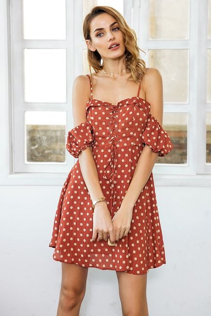 El hermoso vestido de verano tiene tirantes delicados y destaca por sus originales mangas caídas. El estiloso cordón y el motivo de lunares le dan un toque fresco al vestido.