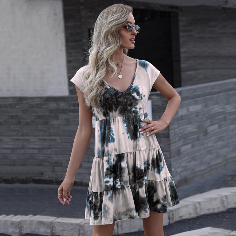 • Elegante vestido de verano para mujer con escote en V, mangas cortas y un hermoso patrón batikado.