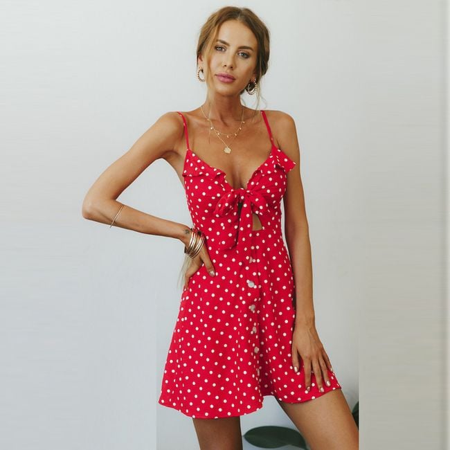 El vestido de verano con lunares y botones será una pieza increíble para los calurosos días de verano. En la parte delantera está decorado con botones y un lazo en la zona del pecho.