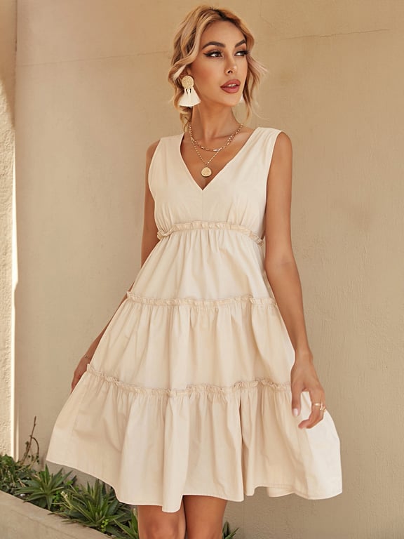 • Vestido de mujer muy elegante y cómodo en corte A, con tirantes anchos y escote en forma de V tanto en la parte delantera como en la trasera.