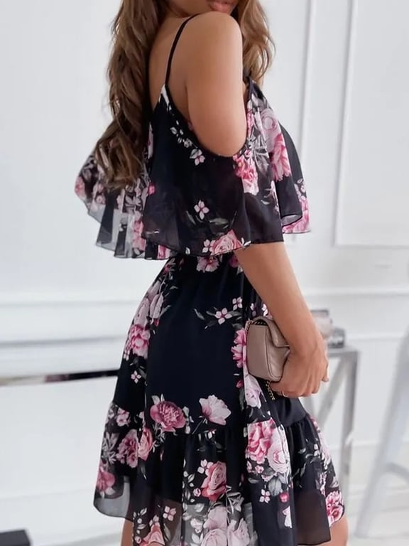 Vestido de verano floral elegante para mujer con hombros caídos.