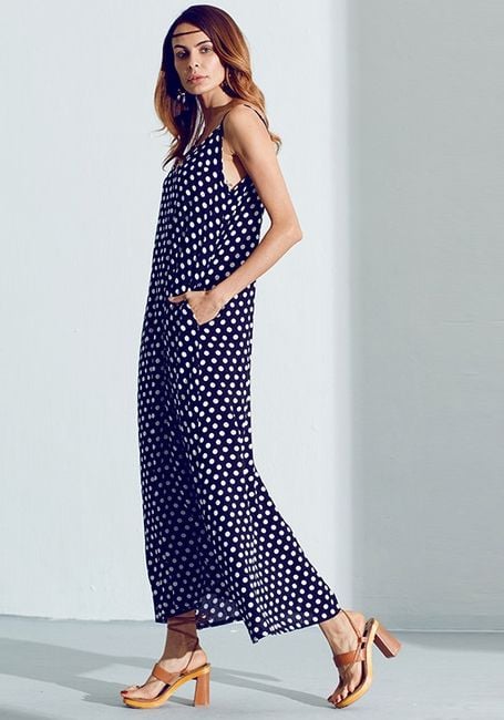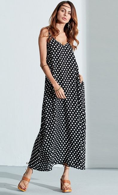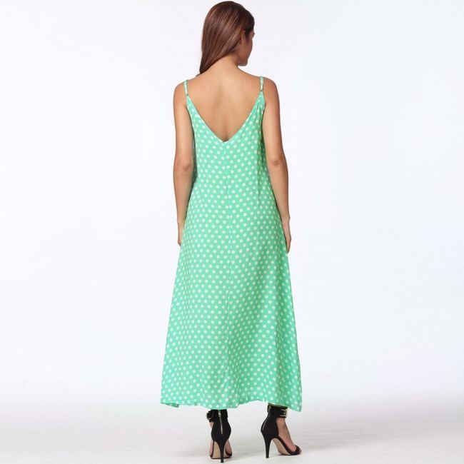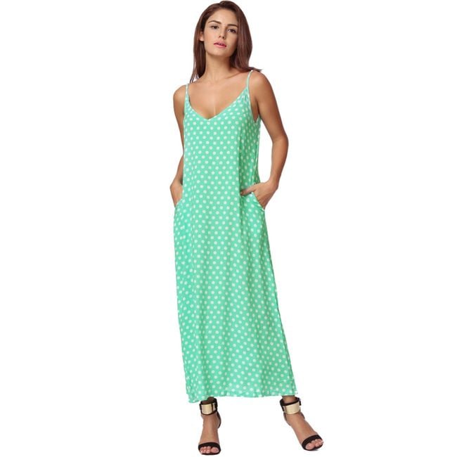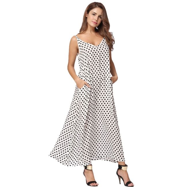 El vestido suelto es ideal para el clima de verano. El material ligero es agradable para la piel. El vestido está decorado con clásicos lunares. Adecuado para la playa, la ciudad y para estar en casa. Opción de elegir entre 6 colores.