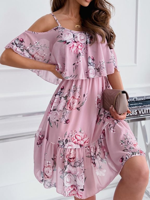 Vestido de verano para mujer con estampado floral y hombros caídos.