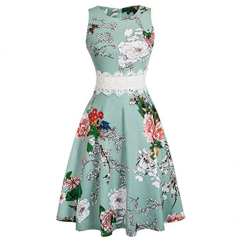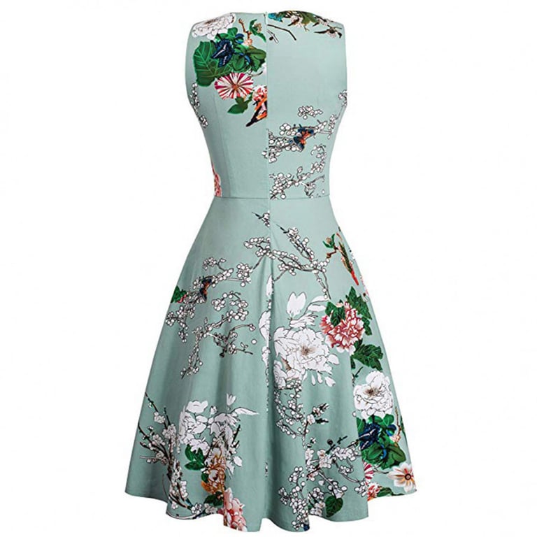 Vestido de verano para mujer con cintura entallada. Falda de corte acampanado con longitud hasta la rodilla. Sin mangas. Con escote redondo. Estampado colorido con motivo floral.