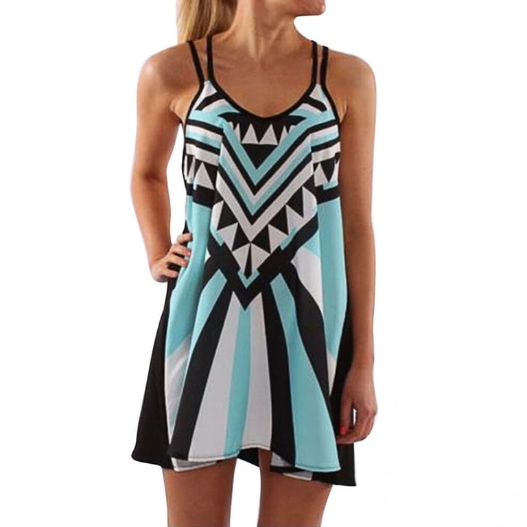 Vestido de verano para mujer con tirantes finos. Corte corto y suelto. Estampado con un patrón colorido. Varias opciones disponibles.