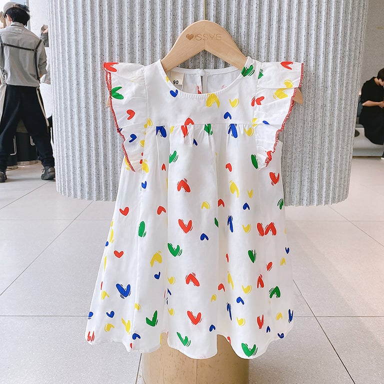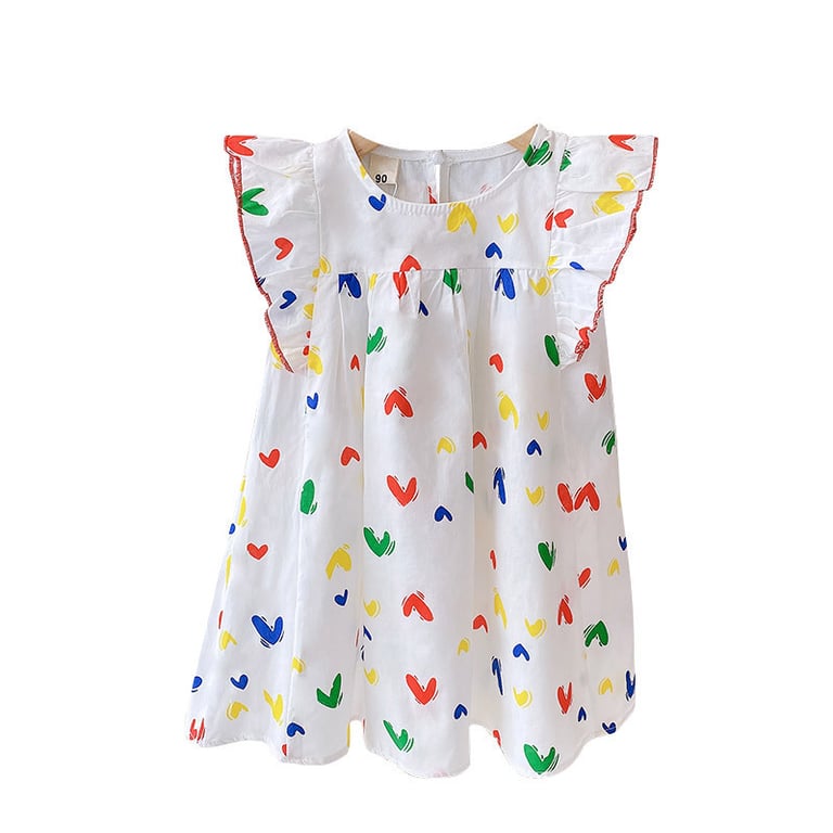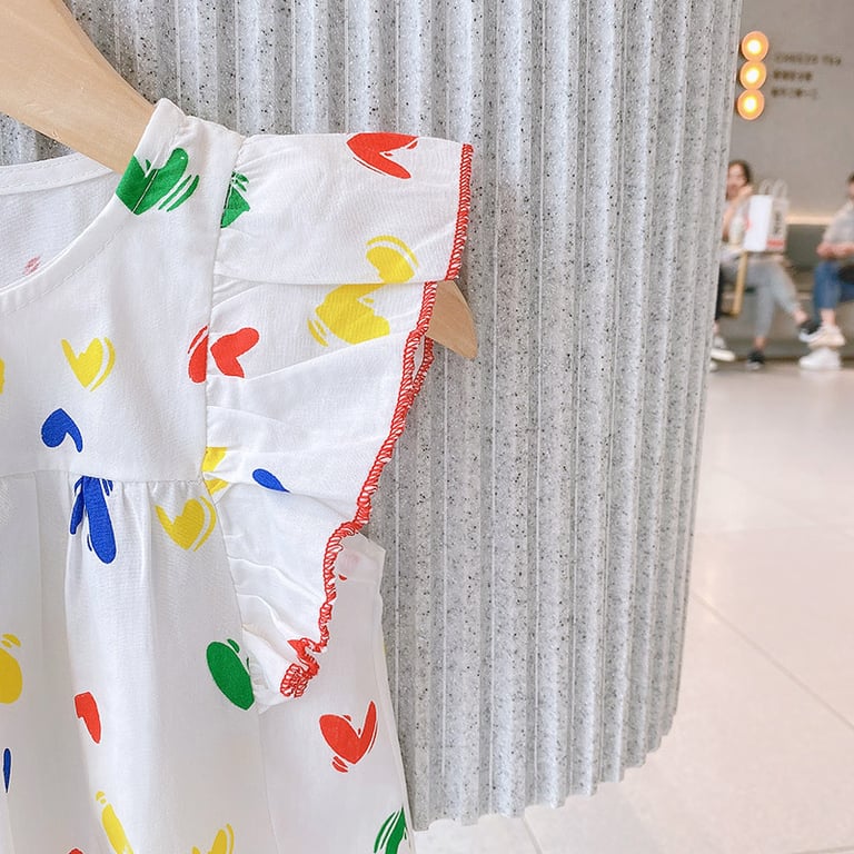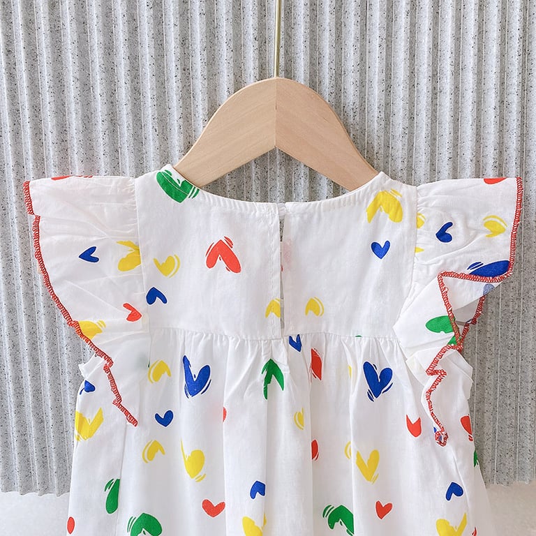 • Hermosos vestidos de verano para niñas con corazones, falda suelta y mangas cortas con volantes.