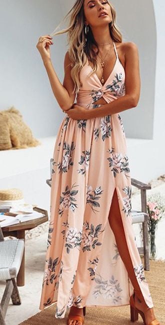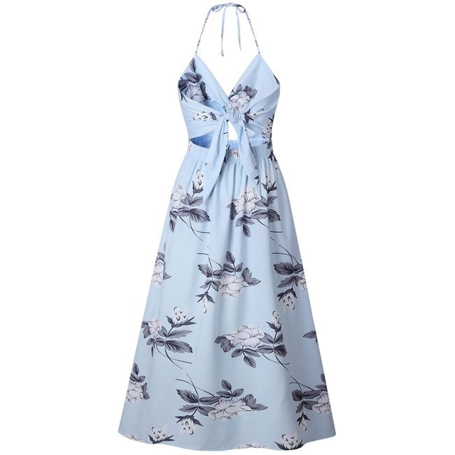 El vestido tiene un patrón floral y tirantes delgados.