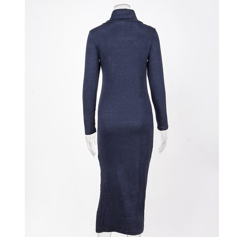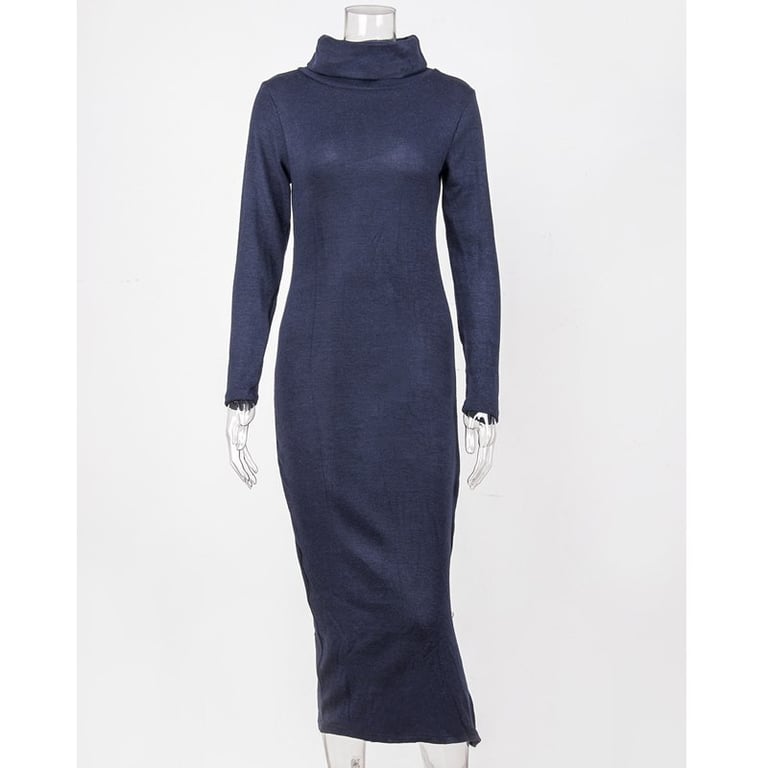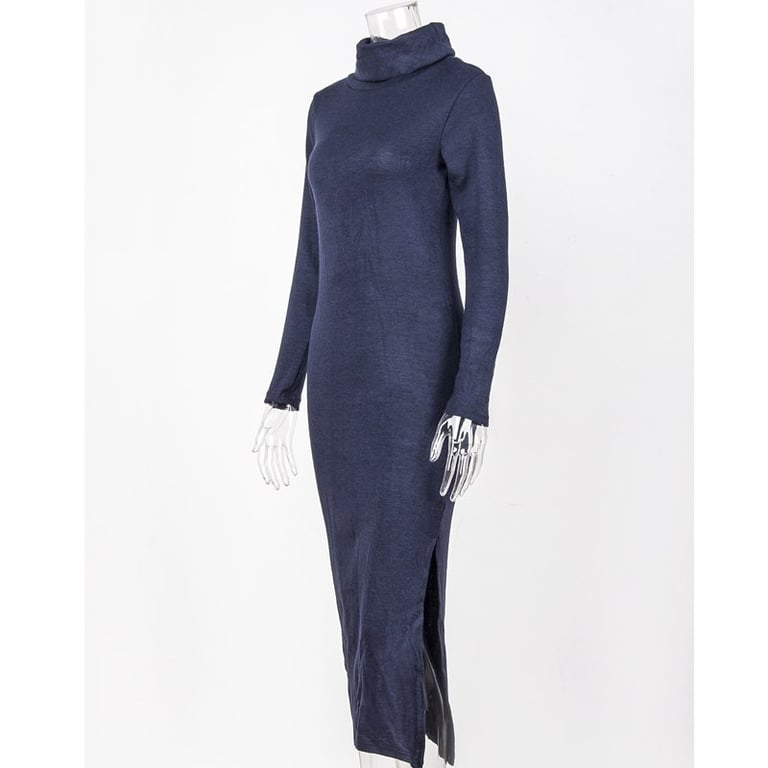 Vestido largo de mujer con cuello alto. El vestido tiene mangas largas, un corte cómodo y una abertura en el costado. Disponible en varios colores.