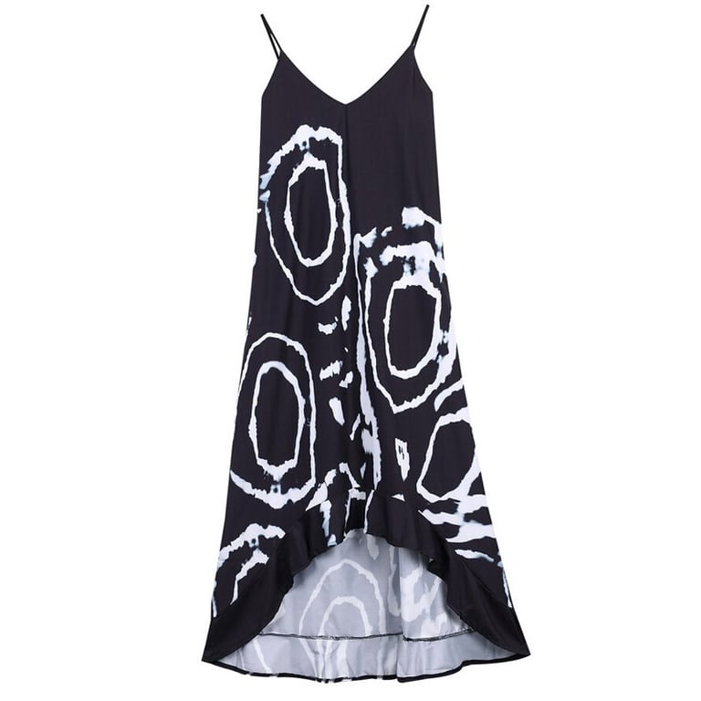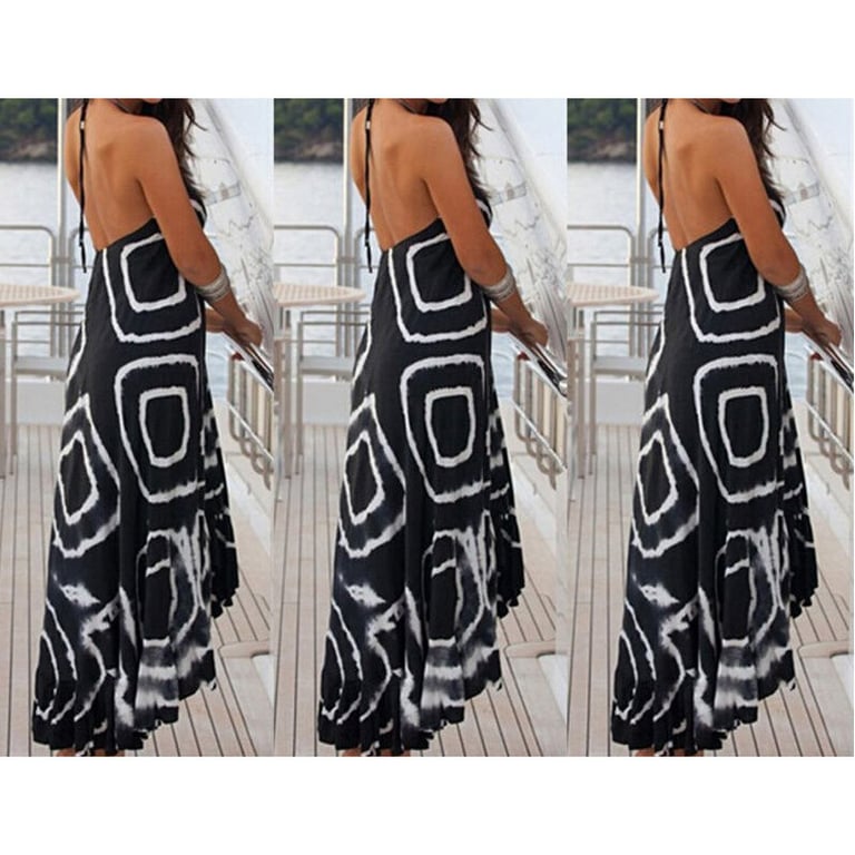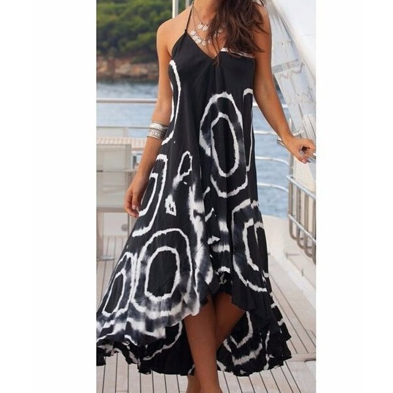 Vestido largo y suelto para mujer, hecho de un material ligero y transpirable. El vestido tiene un escote halter con tirantes delgados que se atan detrás del cuello y un corte asimétrico. Estampado con un diseño en blanco y negro. Ideal para el verano sobre el traje de baño.