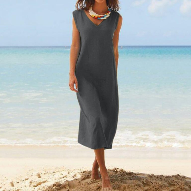 Vestido de verano sin mangas para mujer. Corte largo y suelto con escote en V. De un solo color. Disponible en varias variantes.