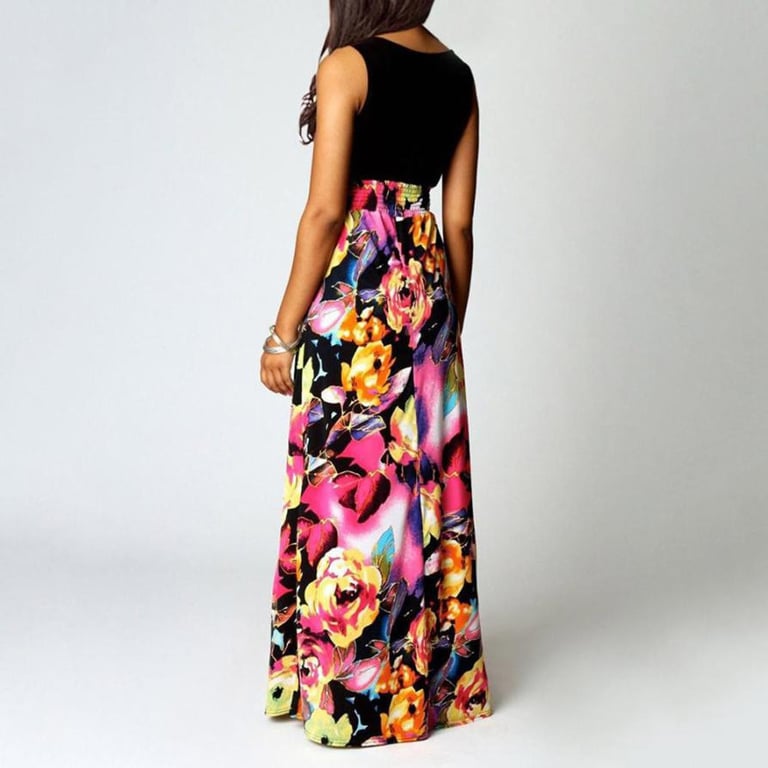 Vestido de mujer con falda larga y estampado colorido. Parte superior ajustada con tirantes anchos y escote redondo.