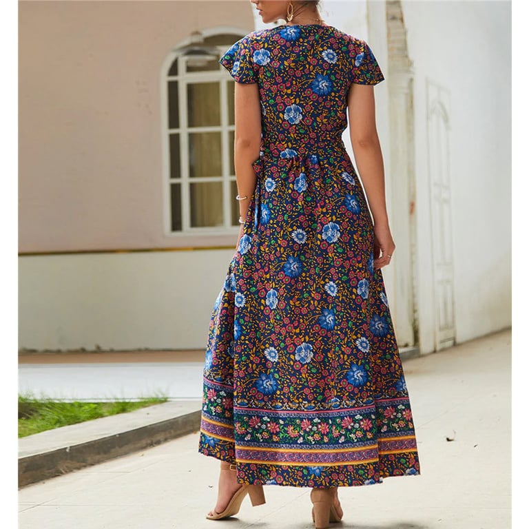 Vestido largo de mujer con mangas cortas. Corte envolvente suelto con cinturón en la cintura para atar. Estampado con un patrón colorido. Varias opciones de color.