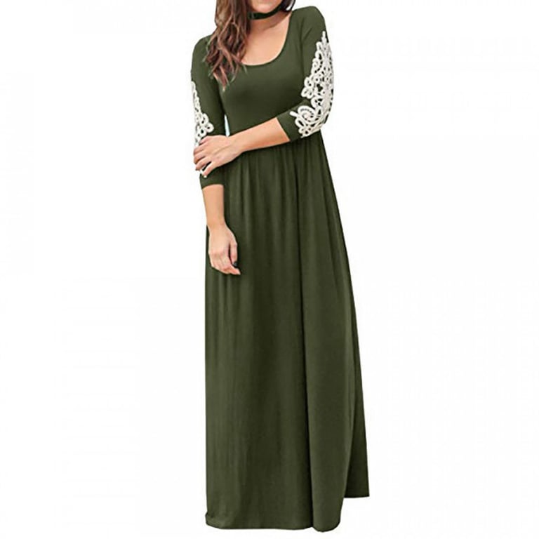Vestido maxi para mujer con escote redondo. El vestido tiene mangas tres cuartos decoradas con un bordado de encaje y una amplia falda larga. Disponible en varios colores.