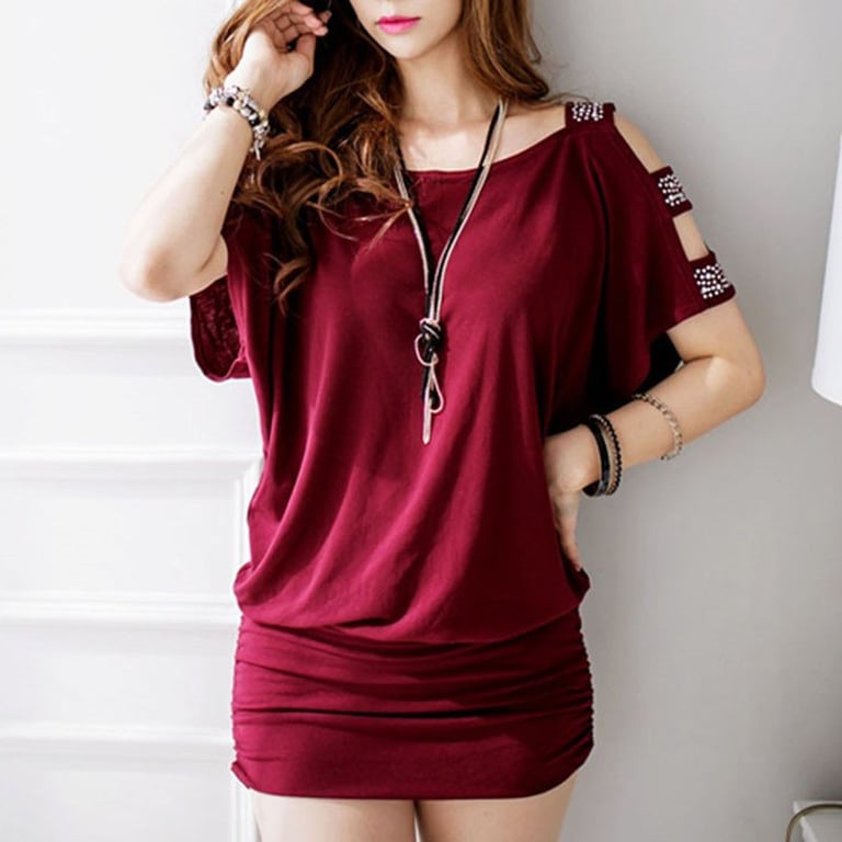 Vestido corto de mujer de corte suelto con parte inferior elástica. El vestido tiene mangas cortas decoradas con piedras brillantes. Escote con hombros al descubierto. Disponible en varios colores.