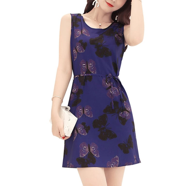 Vestido corto de mujer sin mangas con tirantes anchos y escote redondo. Corte suelto con cinturón para atar en la cintura. Estampado colorido. Disponible en varias opciones.