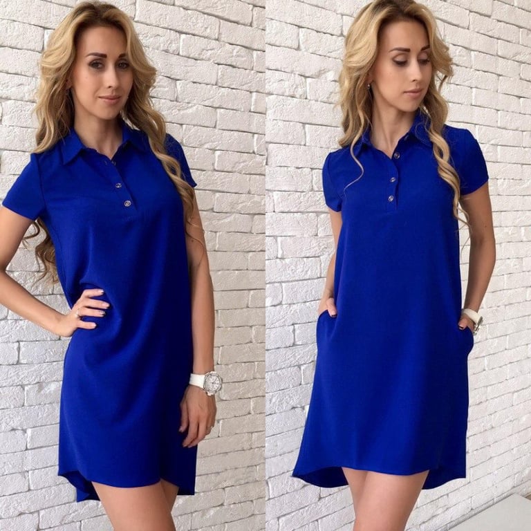 Vestido de polo para mujer con mangas cortas. El vestido tiene un escote con cuello y cierre de botones. Corte holgado y cómodo. Disponible en varias opciones de color.