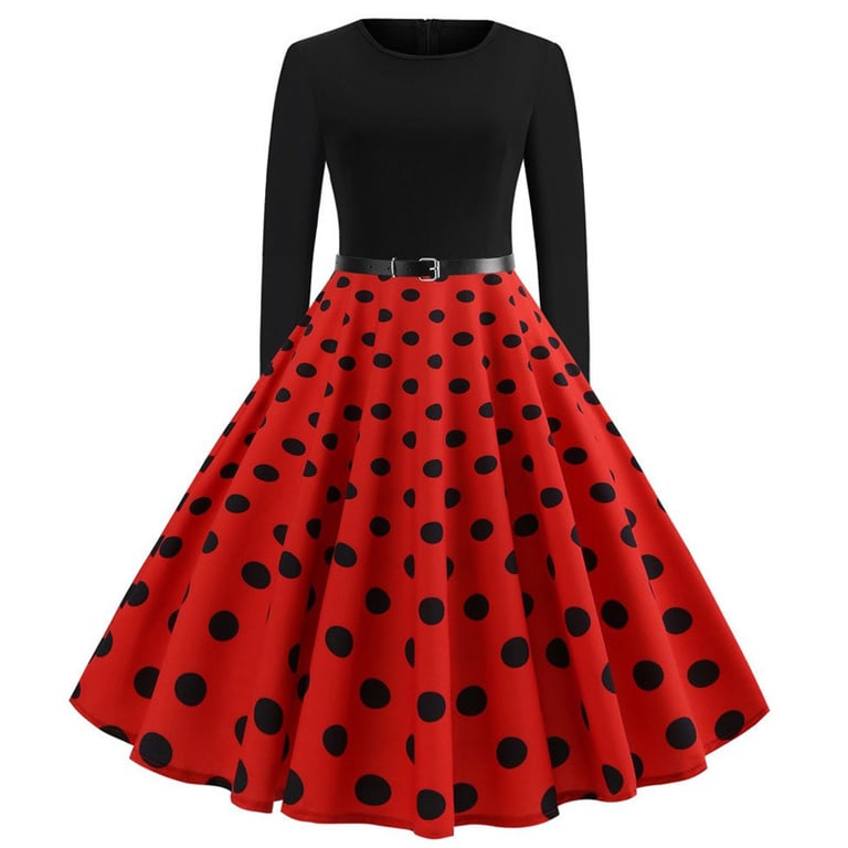 Vestido de mujer de estilo retro con una falda amplia y voluminoso. El vestido tiene mangas largas, escote redondo y se puede ajustar en la cintura con un cinturón. Disponible en varias variantes.