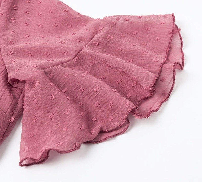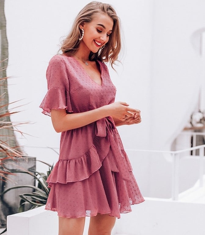 Delicado vestido de mujer con volantes y un suave patrón de lunares.