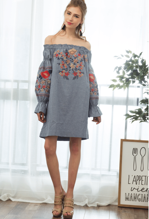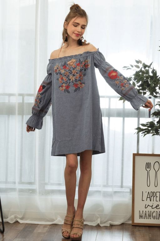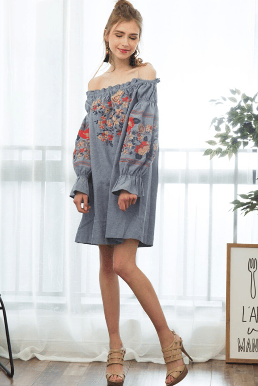 Vestido suelto de mujer gris con flores y parches.