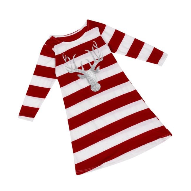 El vestido tiene un estampado de reno y es adecuado para ti y tu niña.
