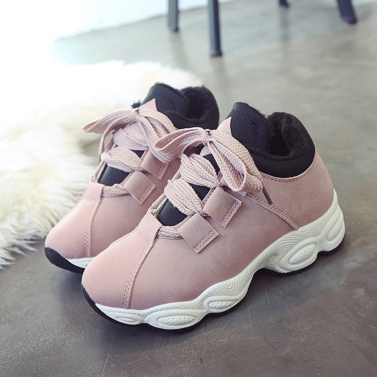 Zapatillas bajas de mujer con cordones en una plataforma alta. Los zapatos están forrados con pelaje en el interior. Disponibles en cuatro variantes de color: negro, blanco, rosa, gris.