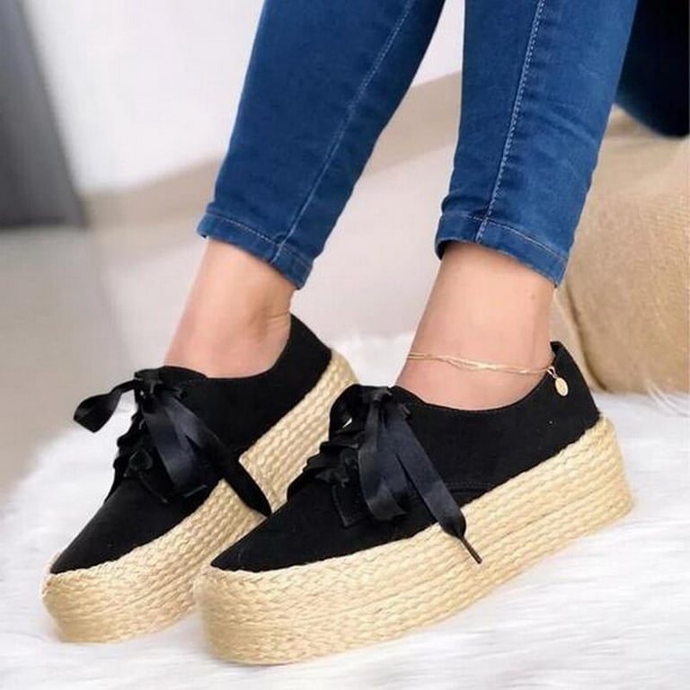 Zapatillas de mujer con cordones de satén. Punta redonda. Suela de yute con plataforma alta. Disponibles en varias opciones de color.