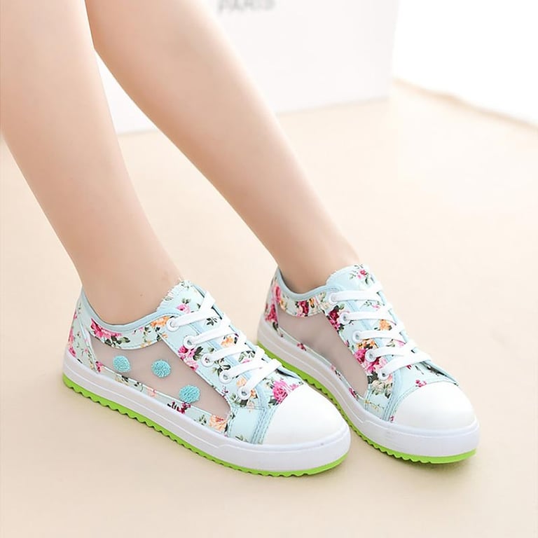Zapatillas de mujer con cordones. Punta redonda firme. Suela plana con estrías. Impresión de colores.