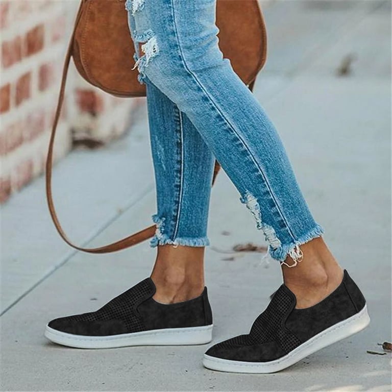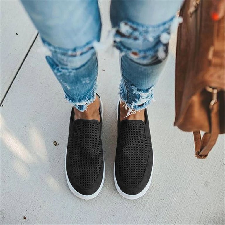 Zapatos bajos de mujer tipo slip-on con suela de goma plana. Sin cordones. De cuero sintético con perforaciones. Disponible en varias opciones de color.