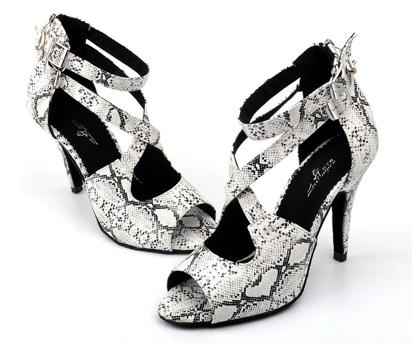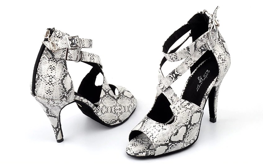 Estos zapatos de baile con estampado de serpiente están diseñados para bailes sociales.
