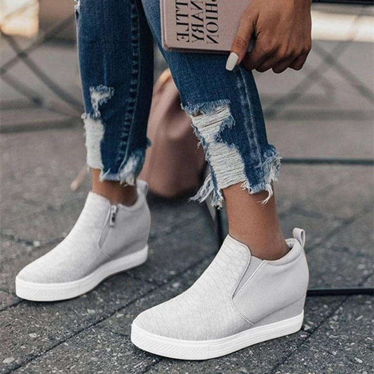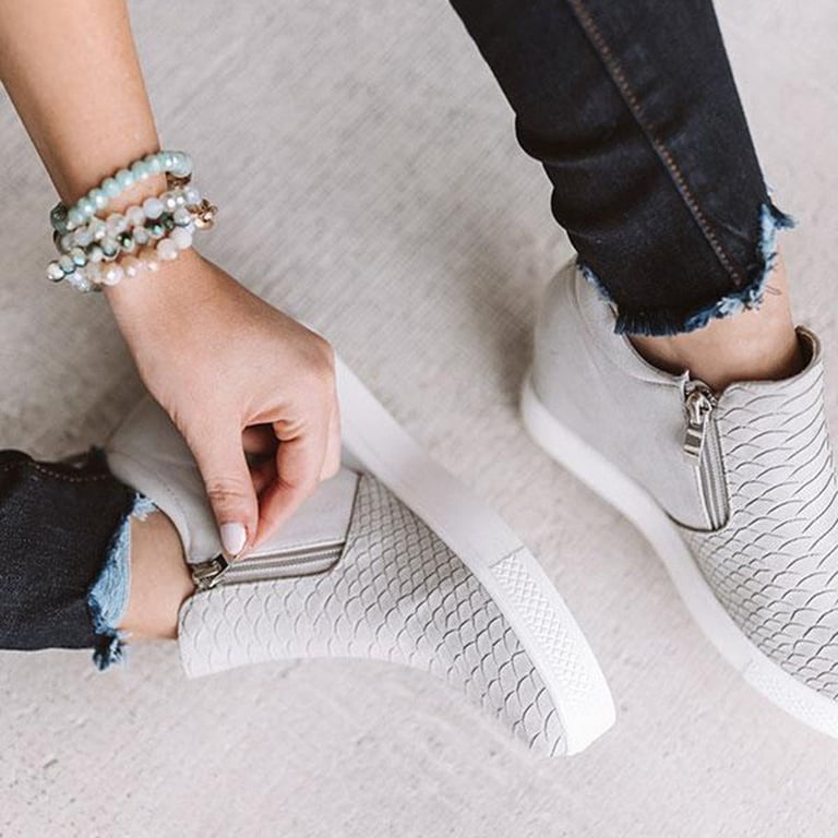 Zapatillas de mujer de tobillo con plataforma alta. Suela de goma plana. De imitación de cuero con patrón animal. Cierre con cremallera en el lado interior. Disponible en varias opciones de color.