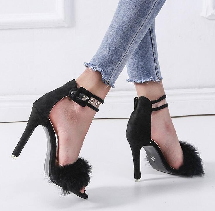Punta abierta, talón cerrado, cierre por encima del tobillo con correa y hebilla.