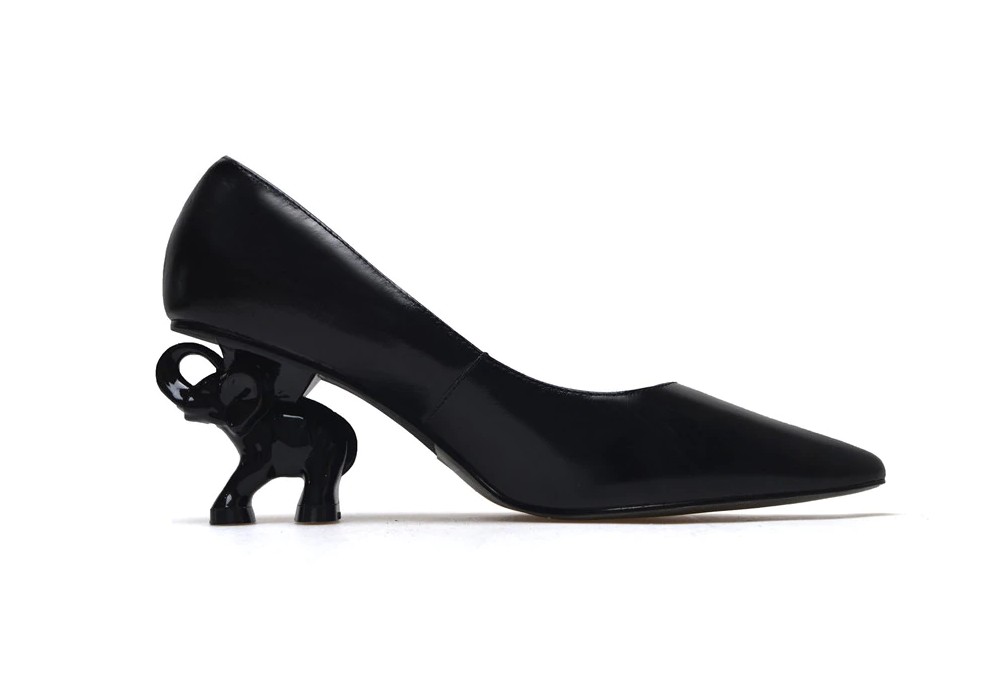 Estos zapatos de tacón tienen un tacón en forma de elefante que sostiene el zapato con su trompa.